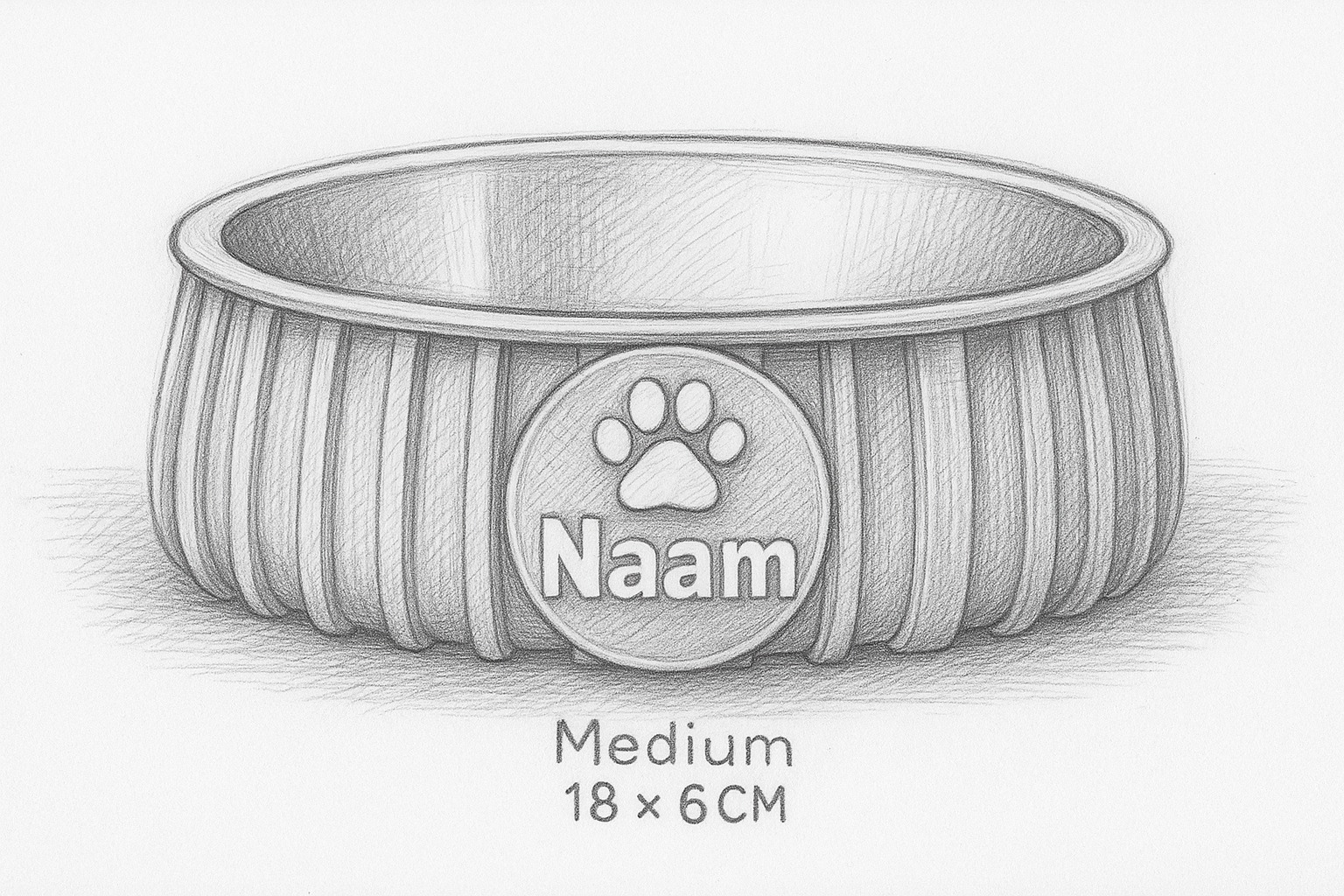 De voerbak bestaat uit een stevige buitenbak in een kleur naar keuze en een uitneembare roestvrijstalen binnenbak. Dit zorgt voor optimaal gebruiksgemak en eenvoudige reiniging. Op de voorzijde plaatsen we een rond naamplaatje met pootafdruk, gepersonaliseerd met de naam van jouw huisdier.