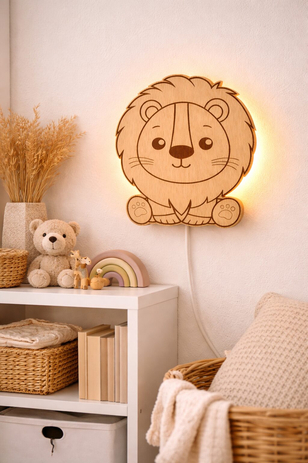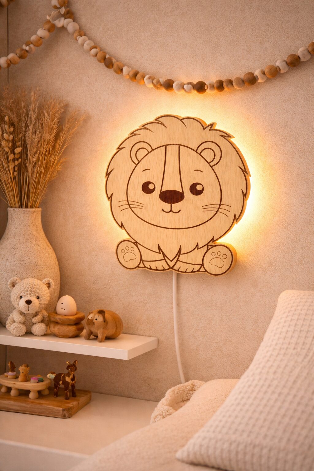 Breng warmte en sfeer in de baby- of kinderkamer met deze unieke houten wandlamp in de vorm van een lieve leeuw. De zachte verlichting zorgt voor een rustgevende en gezellige uitstraling — perfect als nachtlampje of sfeerverlichting.