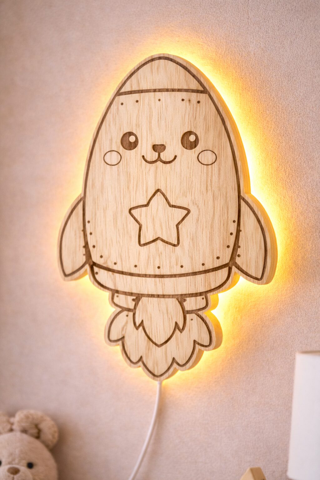 Breng een speelse en warme sfeer in de kinderkamer met deze houten wandlamp in de vorm van een raket.
