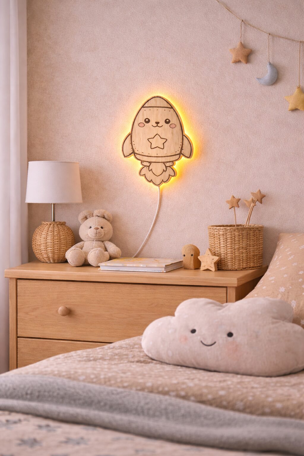 Houten kinder wandlamp raket | LED nachtlamp kinderkamer