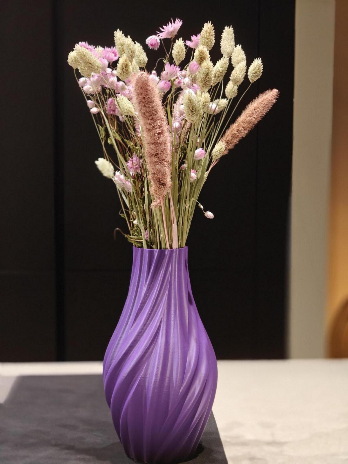 Breng kleur en karakter in je interieur met deze paarse 3D-geprinte designvaas. Het dynamische, gedraaide patroon vangt het licht op een bijzondere manier, waardoor de vaas vanuit elke hoek een andere glans laat zien.