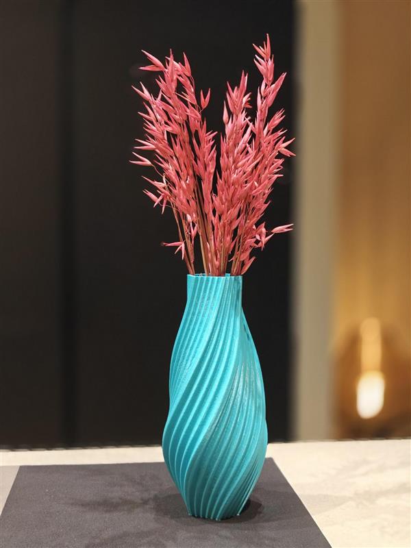 Deze 3D-geprinte turquoise vaas van 23 cm is een echte blikvanger in elk interieur. Met zijn vloeiende, gedraaide ontwerp en frisse kleur brengt hij een moderne maar warme sfeer in huis.